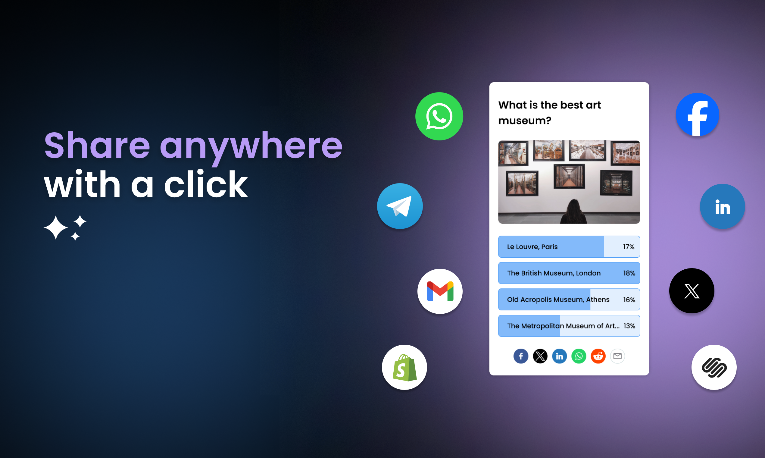 Add to any site (e.g. WordPress, Wix, Squarespace, etc.) or use a landing page on our site. Share with your social networks (e.g. Facebook, X, etc.), messengers & email followers.