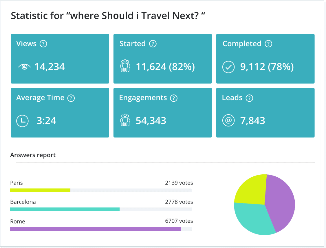 The Opinion Stage trivia generator gives you detailed reports on your quiz results and all aspects of its performance. You will receive: