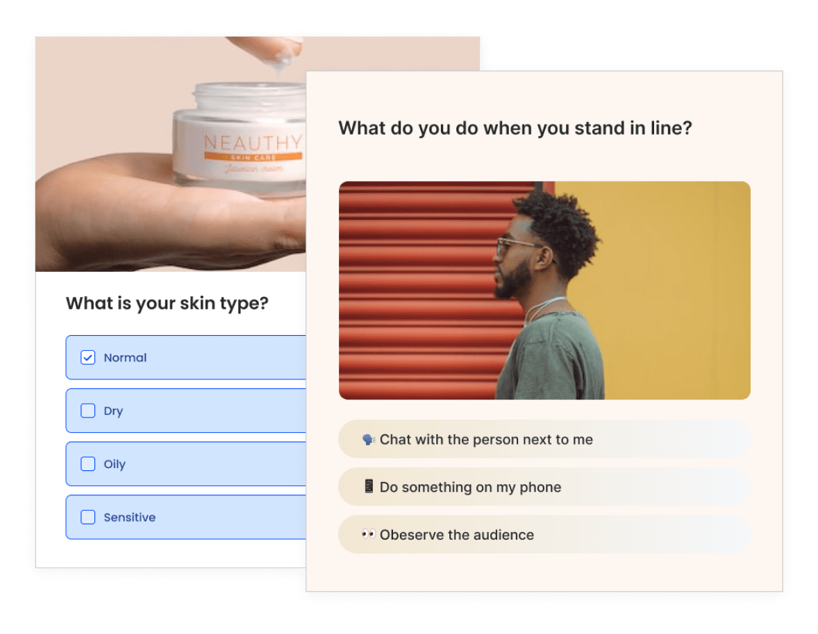 Use images, videos, and GIFs to make your quiz more engaging and help clarify your questions. Visuals allow you to expose potential customers to your brand design, visual language, and flattering images of your products. To help your quiz takers feel more at home and connected with your brand, include images that depict potential members of your target audience (e.g., people of the same age group or ethnicity).