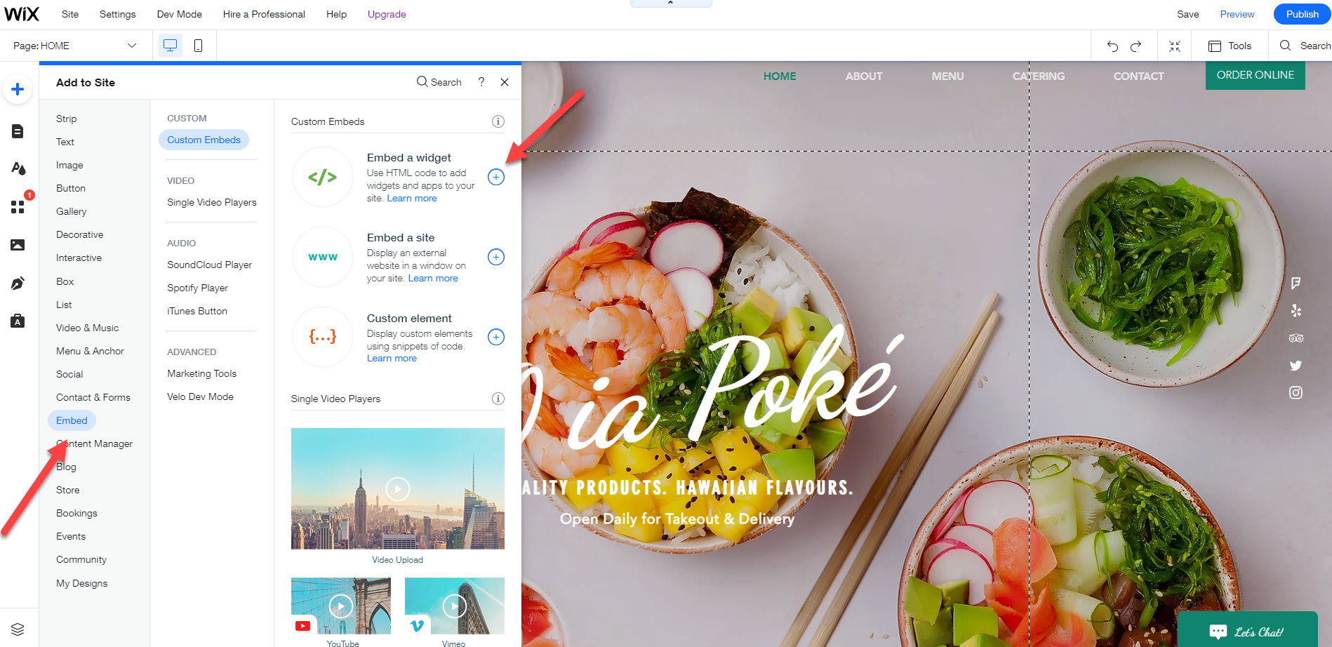 Go to your Wix website. Click the ‘+ Add’ button. Under ‘Add to Site’ select ‘Embed’. And under’ Custom Embeds’ select ‘Embed a Widget’.