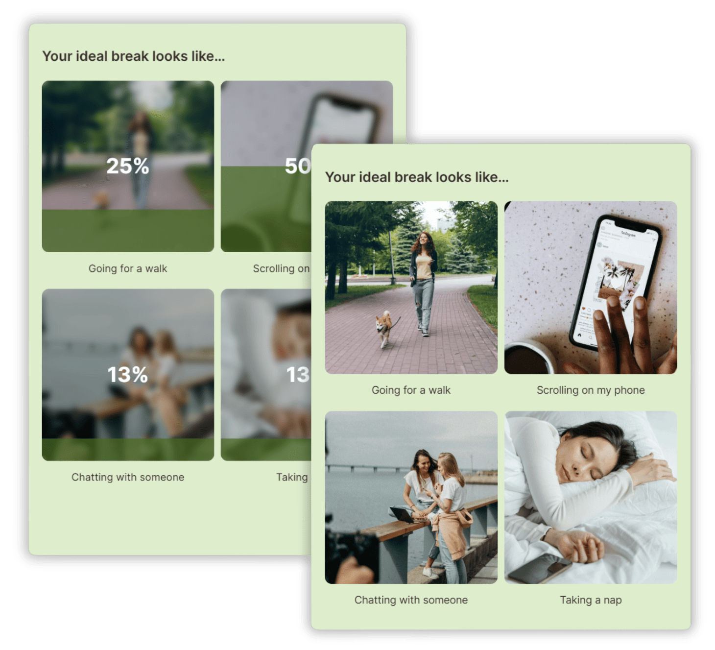 Visual polls make voting faster, easier, and more engaging for your audience. With images, videos, and visual answer layouts, people can quickly react and participate.