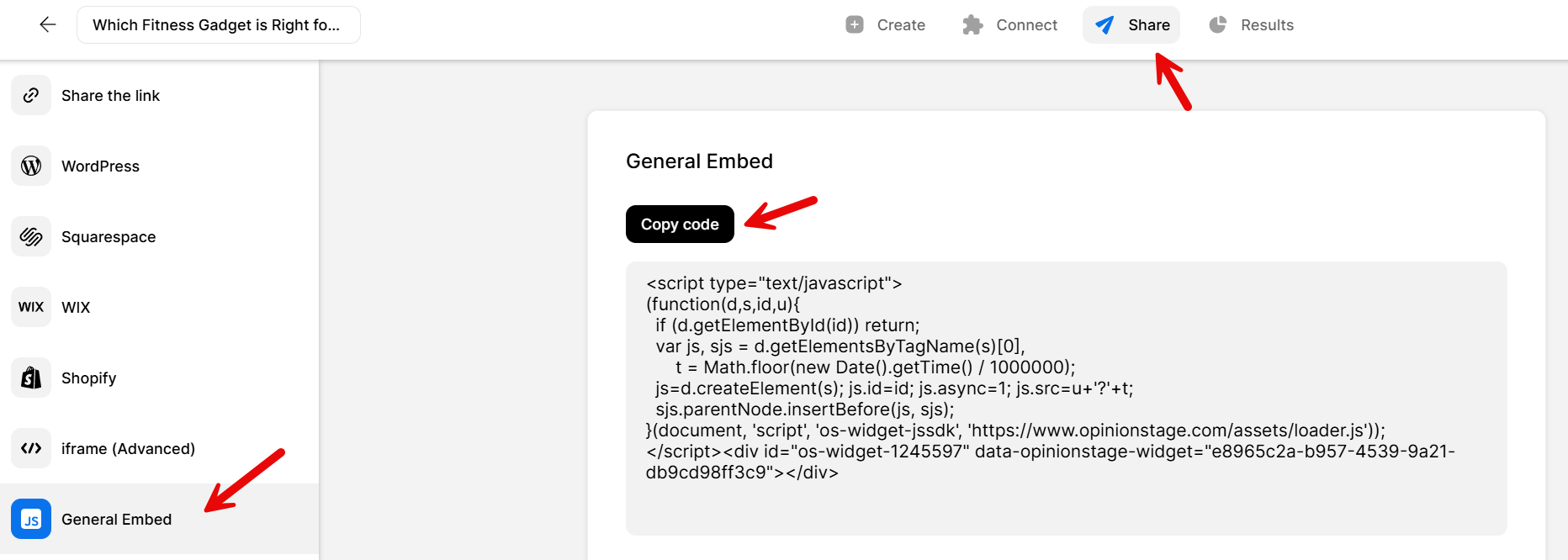 Click on the Share button at the top of your screen and then click on the General embed tab. Copy the embed code.