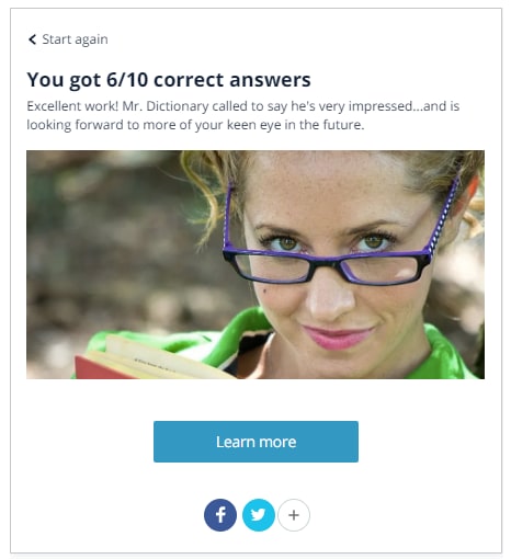 When your students finish the vocabulary quiz, they will see a page with their final results. You can use this opportunity to give them feedback on their performance, encourage them to keep practicing or offer additional resources for learning.
