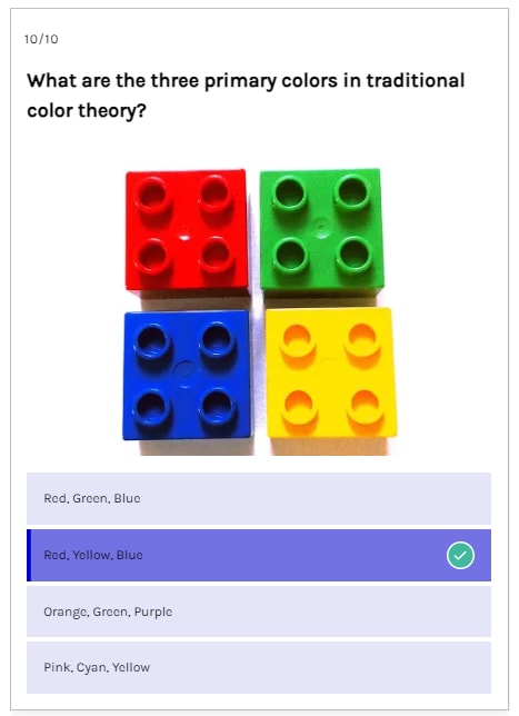 Multiple-choice questions give you several different answers to choose from. Depending on the type of quiz you’re making you could have some wrong answers and one correct answer, multiple correct answers, or, answers that are not right or wrong but represent different preferences.