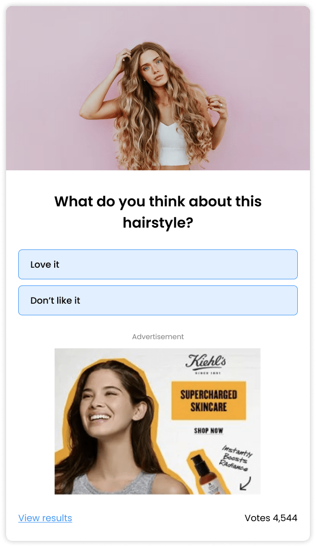 Ads located in or around polls & quizzes get fantastic engagement and click-through rates. Increase the ad revenue of your site while delighting your users with highly engaging personalized content.