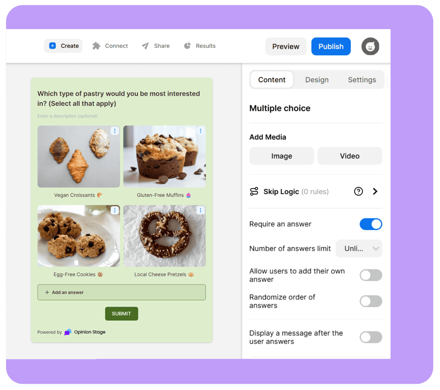 Opinion Stage’s survey maker helps marketers and business owners collect feedback and understand their audience through visual, conversational surveys that get more responses.